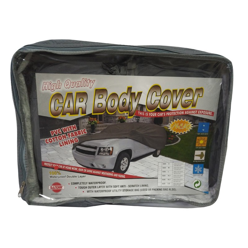 Large Weatherproof Durable Car Cover comes with a tough outer-layer and a soft anti-scratch lining. Edged with heavy duty elastic hems at the front and at the back to give it a snug, secure fit. Comes with a carry case so you can pack it up when not in use. Waterproof utility storage bag.