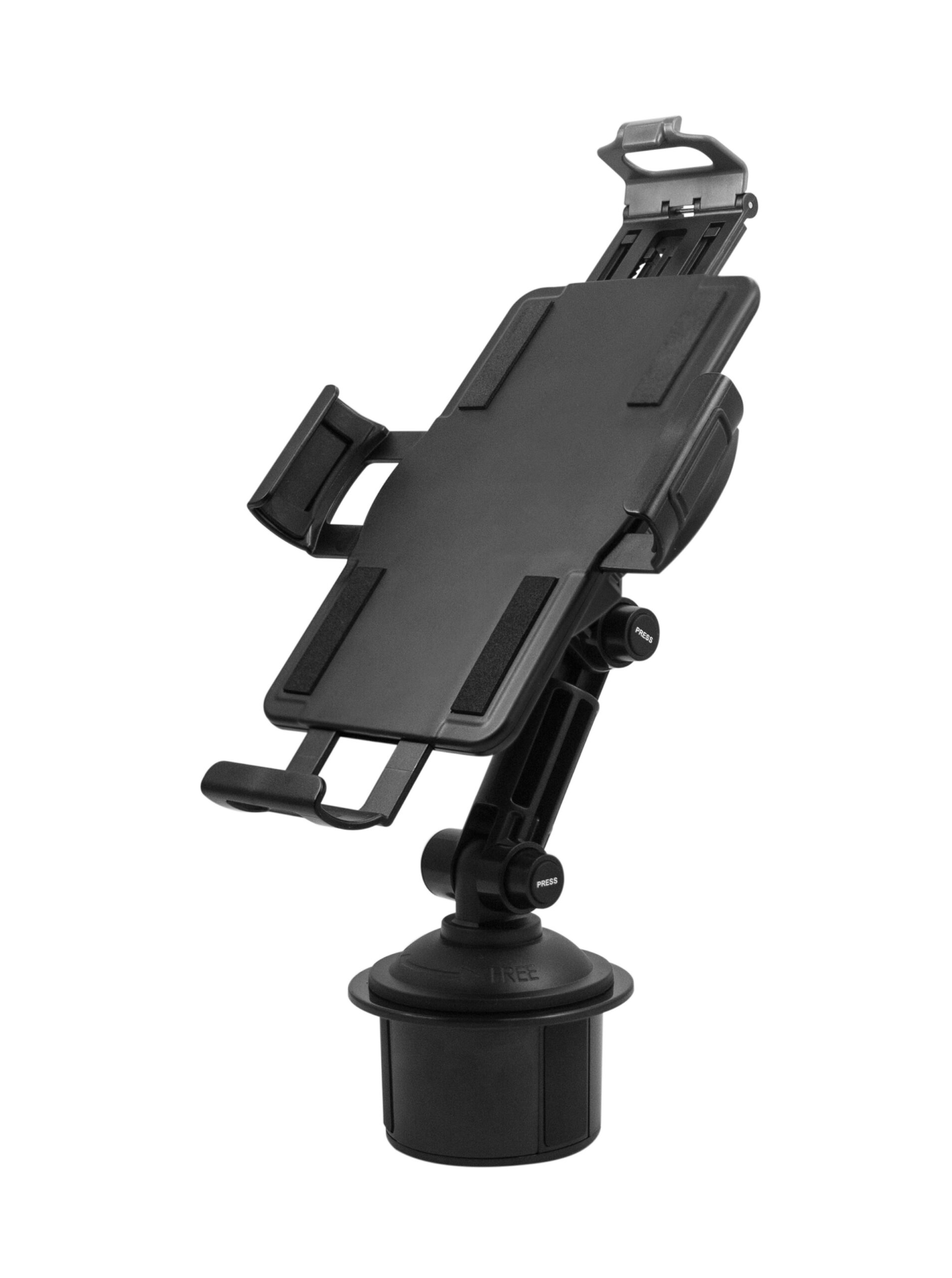 Tablet and ipad cradle is easy to mount in drink holder of console unit. Easy adjustment of vertical and horizontal viewing angle