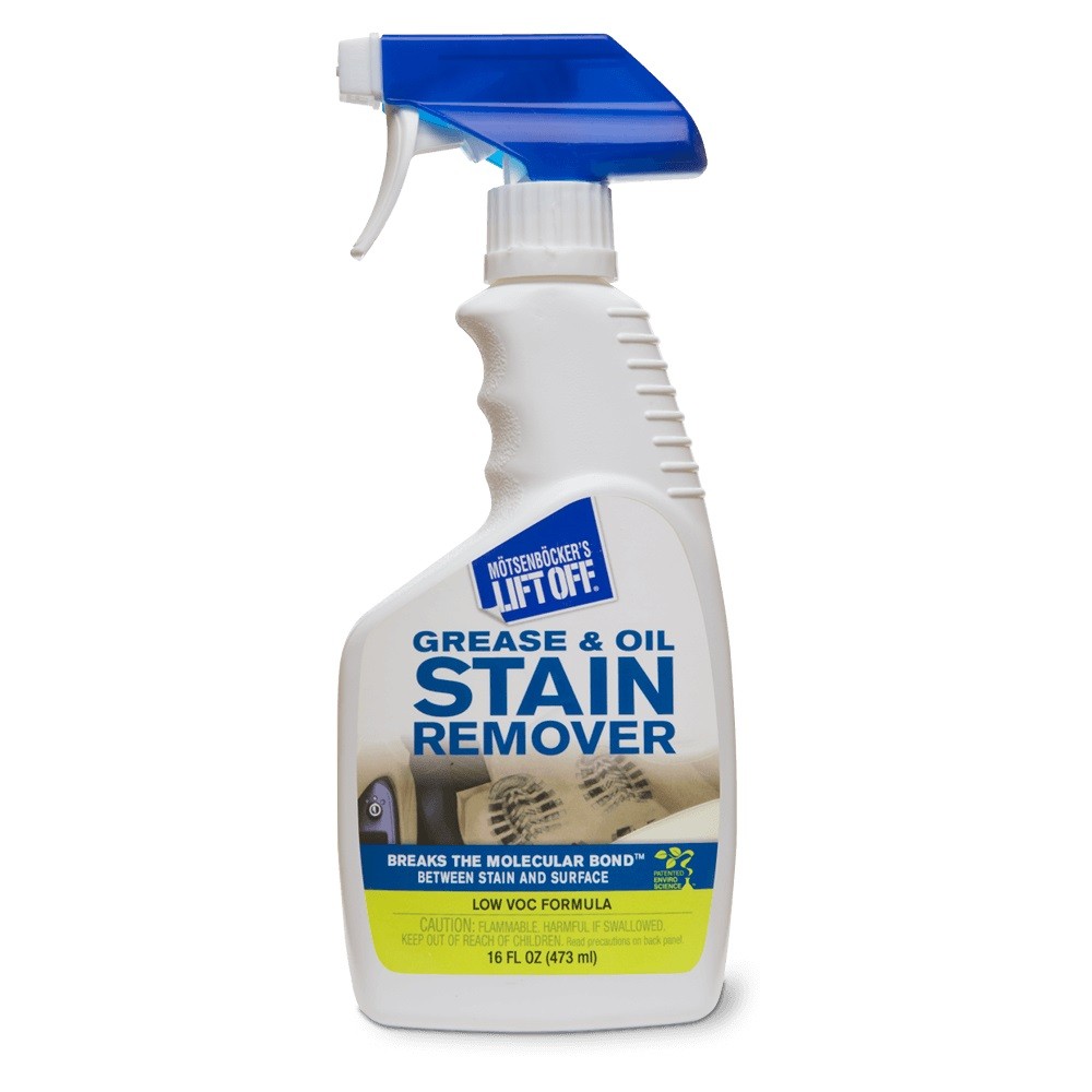 The patented formula of Motsenbocker’s Lift Off Breaks the Molecular Bond for fast easy removal grease, oil, motor oil industrial greases, stickers, glues and chewing gum. Works on carpe,t fabric upholstery,, floor mats trunk interiors seats and child safety seats.