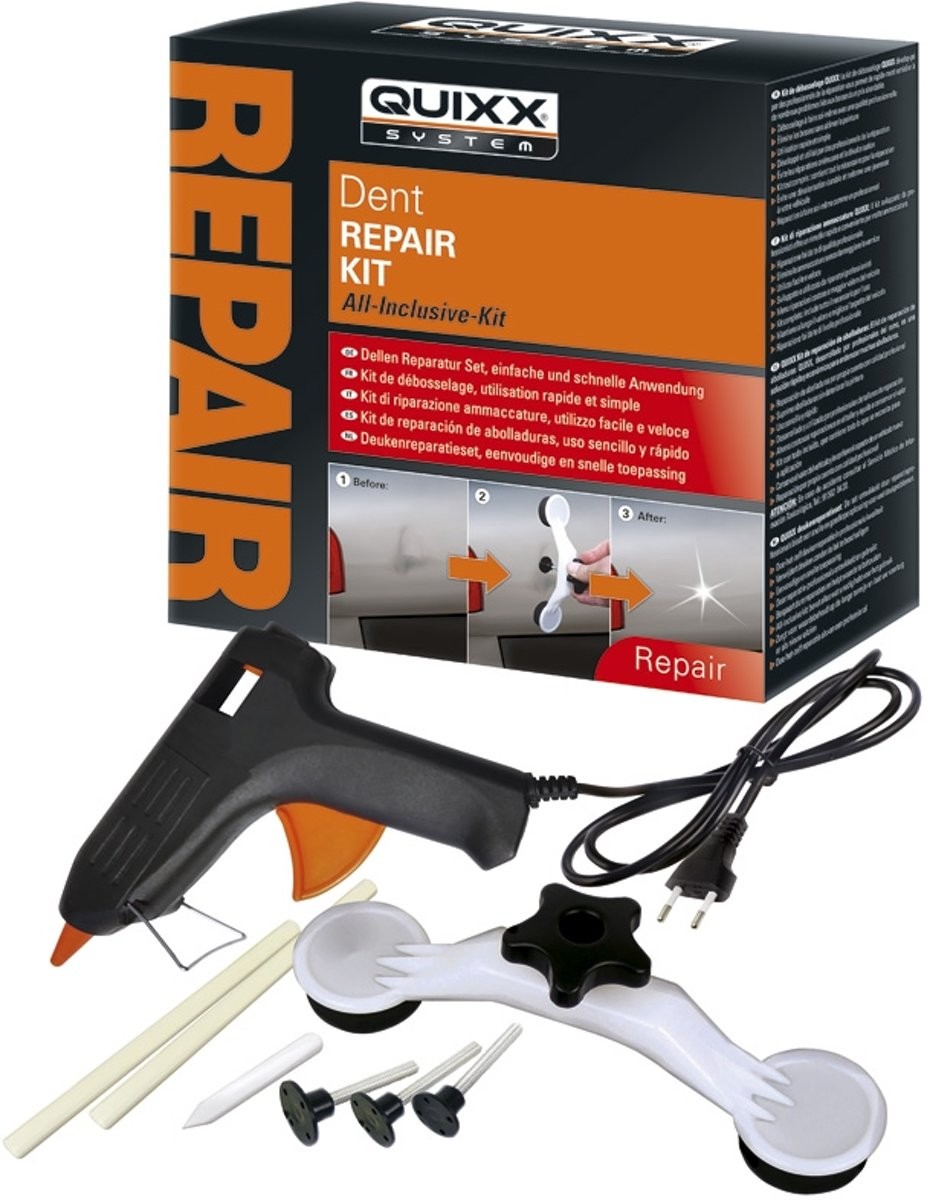Professional quality DIY dent repair kit Removes dents without damaging the paint Suitable for most dents in flat car body areas Simple and fast application Developed and used by repair professionals Helps avoid costly repairs and maintains value All-Inclusive-Kit: It contains everything you need for the repair process Developed by car body professionals Removes dents without damaging the paint