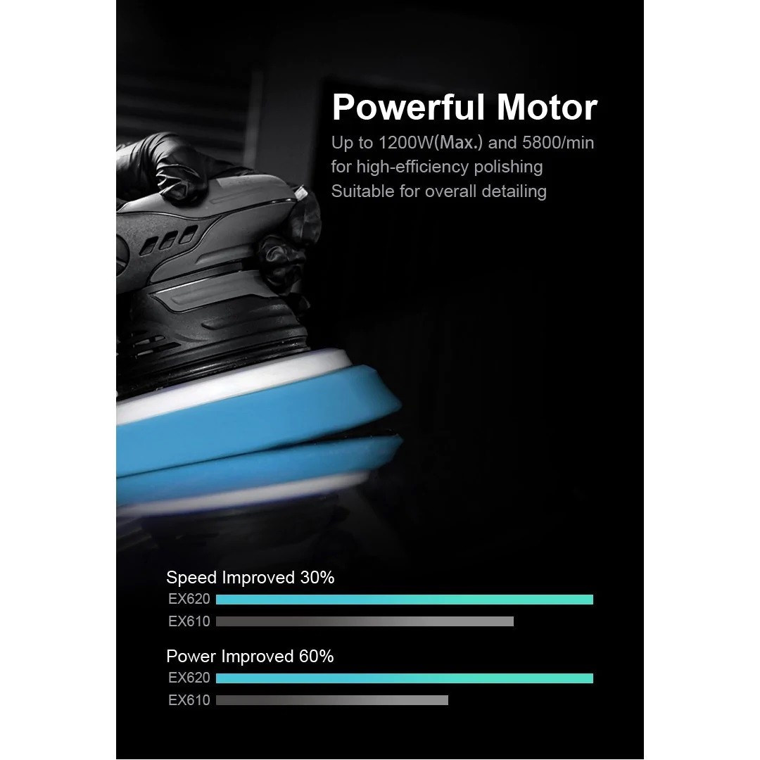 The new and improved 15mm Polisher from Shinemate with more power, torque & overall design improvement. The EX620 is a complete generational leap in technology, designed for the professional. This new, unique machine has 60% more power and torque, and 30% more speed than the previous model (1200w and 5800/OPM) – all without sacrificing the balance of the machine. New Shinemate EX620 polisher now with progressive trigger, more balanced, more power at 1200 watts and less stalling!
